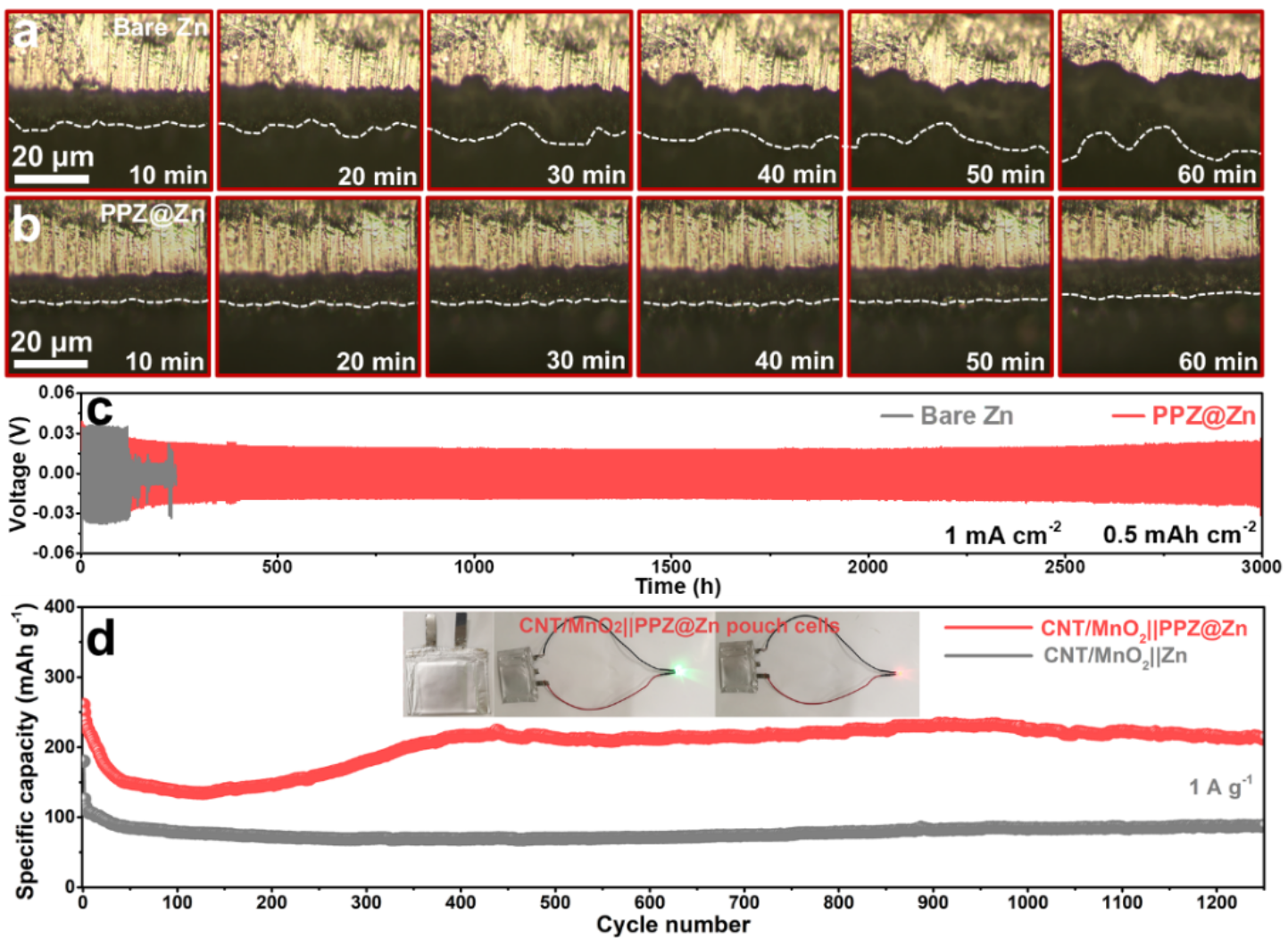 研究者采用酸溶液对具有高表面能和低结合能的锌晶面进行选择性腐蚀。一方面,随着酸腐蚀时间的延长,(002)Zn与(100)Zn的峰强比由0.83(0分钟)提高到3.38(4分钟),实现(002)Zn晶面的选择性暴露,基于(002)Zn晶面均匀的表面电荷密度和低电化学活性,(002)Zn晶面选择性暴露可优化Zn沉积行为、提高电极耐腐蚀性;另一方面,经磷酸、植酸、柠檬酸和草酸腐蚀后,锌负极表面可原位生成锌化合物层,其作为锌金属与电解液的界面不仅能够抑制锌金属腐蚀还可增强电极对Zn2+ 的吸附能力,有利于锌沉积/剥离过程。通过电化学性能测试发现,磷酸锌@锌(PPZ@Zn)电极的对称电池在1 mA cm-2的电流密度下能够稳定循环3000 h。进一步以PPZ@Zn为负极,CNT/MnO2为正极组装全电池,CNT/MnO2||PPZ@Zn全电池在1 A g-1稳定循环1250圈后仍可保持213.0 mAh g−1的比容量,相对于CNT/MnO2|| Zn全电池有明显的提升。该工作为锌金属负极表面/界面改性提供了新方法,对高性能水系锌离子电池负极的研究具有重要意义。