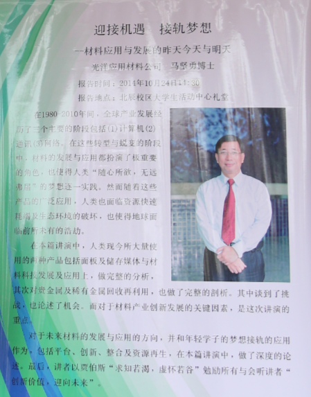 应英国365上市公司邀请,台湾光洋集团执行董事马坚勇博士于2014年10月24日来我校访问并做学术报告,欢迎广大师生积极参加! 报告时间:10月24号,下午2:30-5:00 报告地点:北辰大学生活动中心礼堂 报告题目:迎接机遇接轨梦想——材料应用与发展的昨天今天与明天 内容简介:报告主要分析了面板及储存媒体与材料科技发展及应用的关系,对贵金属及稀有金属回收再利用进行了完整的剖析,重点讲述了材料产业创新发展的关键因素,以及未来材料的发展与应用方向。 马坚勇博士简介 马坚勇,德国斯图大学博士,台湾光洋应用材料科技股份有限公司执行董事。 马博士曾任台湾中山科学研究材料发展中心担任副工程师,于1997年获得台湾优秀青年工程师。2000年加入华新丽华公司,建立起台湾第一个微机电八吋制造厂和CMOS-MENS的技术平台,于2005年获台湾微机电产业贡献奖。2007年加入光洋应用材料公司,带领公司取得高密度硬盘用靶材国际市场占有率第一,公司获得2012及2013年台湾工业精锐奖及产业创新奖,并于2014年获得台湾年度材料杰出贡献奖。