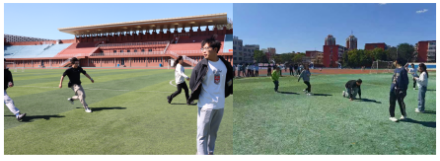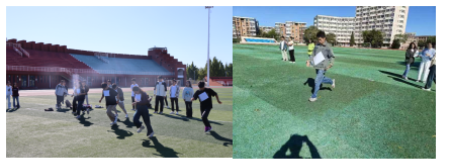 第一项为纸衣往返接力,同学们将白纸贴到前胸,在奔跑的过程中保持不掉,跑到终点处的同伴后,接力继续往起点处跑,用时最短的队伍获得胜利。