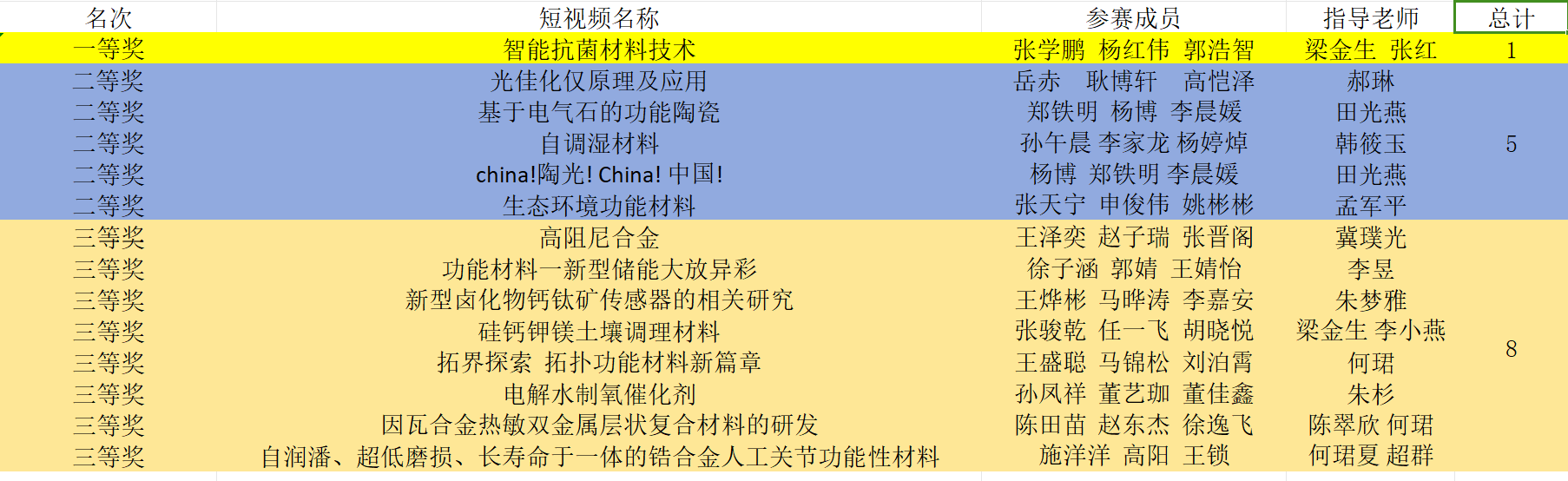 《第一届全国大学生功能材料短视频大赛于 2024年举办,《第一届全国大学生功能材料短视频大赛》组委会共收到来自国内46所高校的324份作品,英国365上市公司在大赛中表现突出,1人获得一等奖,5人获得二等奖,8人获得三等奖!总体获奖情况在参赛高校中名列前茅。