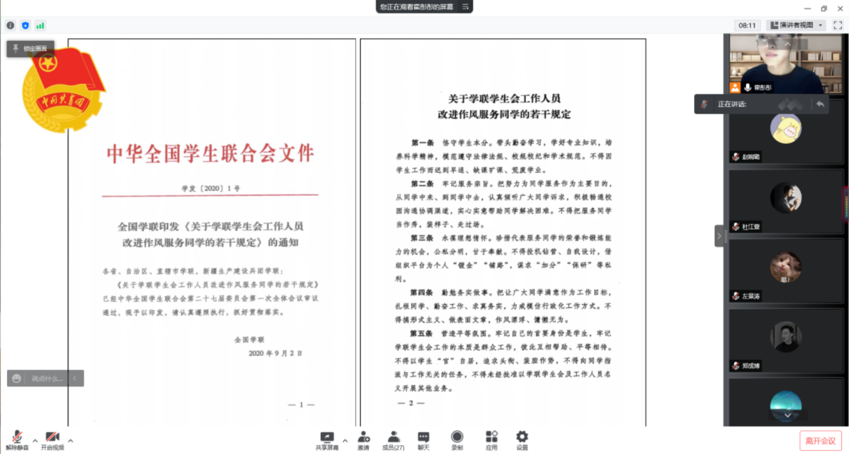 应团省委、省学联要求,为切实落实《关于学联学生会工作人员改进作风服务同学的若干规定》,加强学生会工作人员宗旨意识和规章制度教育,切实将学习成果体现在全心全意为同学的服务上。