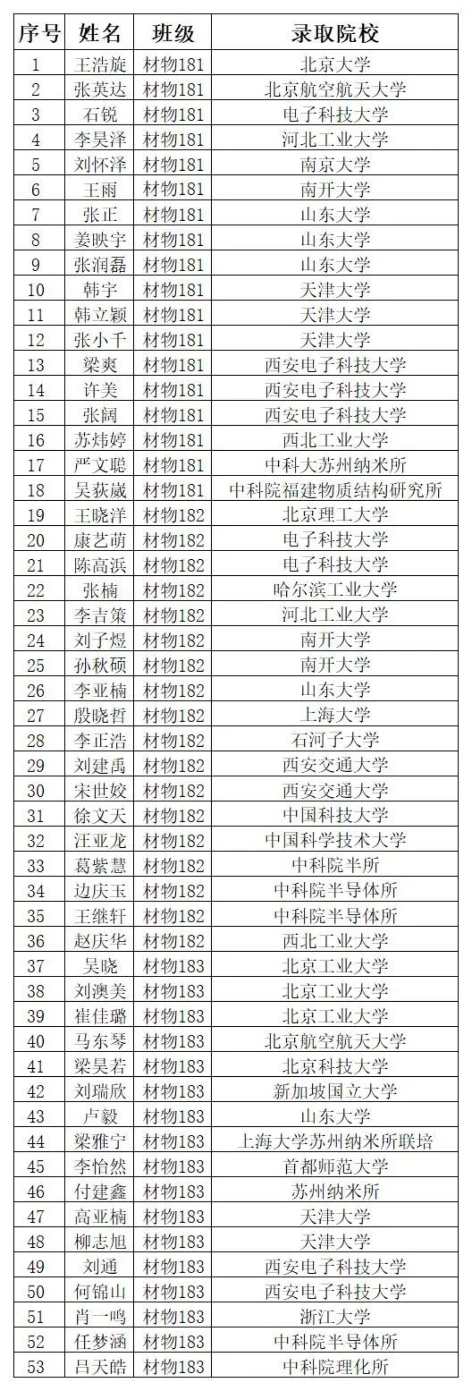 材料物理专业共计89人,确定升学人数53人,专业升学率59.55%