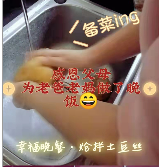 有亲自下厨,为父母做饭。虽然做的“黑暗”料理不是那么可口,但在父母眼里那就是最可口的美味。