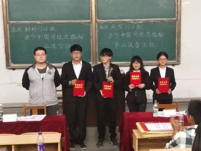 比赛开始前,整个报告厅可谓人声鼎沸,观众热情高涨。随后各方辩手进行了自我介绍。然后比赛开始:第一个环节为开篇立论,正方一辩先是分析了当代中国同性恋的形势,随后又根据现在同性恋受歧视的社会现状,论证了本方的论点。而反方一辩由:当今法律不完善,立法条件不成熟,对同性恋认识不足论证了本方观点。场上双方选手你来我往,针锋相对,气氛激烈;场下观众时而屏息倾听,时而掌声热烈,均被选手迅速的反应力,敏锐的洞察力,优秀的团队协作精神折服。攻辩环节双方你来我往,互不相让,问答步步紧逼,气氛煞时紧张了起来。在精彩的自由辩论环节,双方辩手联系时事与网上热点,结合多种材料论证本方观点,唇枪舌剑,妙语连珠,字字铿锵,步步为营。双方针锋相对,为大家奉献了一场有理有据的精彩辩论。最后,双方辩手围绕本方观点精彩陈词,为本场比赛画上了精彩句号。之后是评委提问环节,针对评委的问题各方辩手机智回答,巧妙应对。最后的观众提问环节带动了大家的热情,同学们与辩手之间的问答引起了观众的热烈掌声。