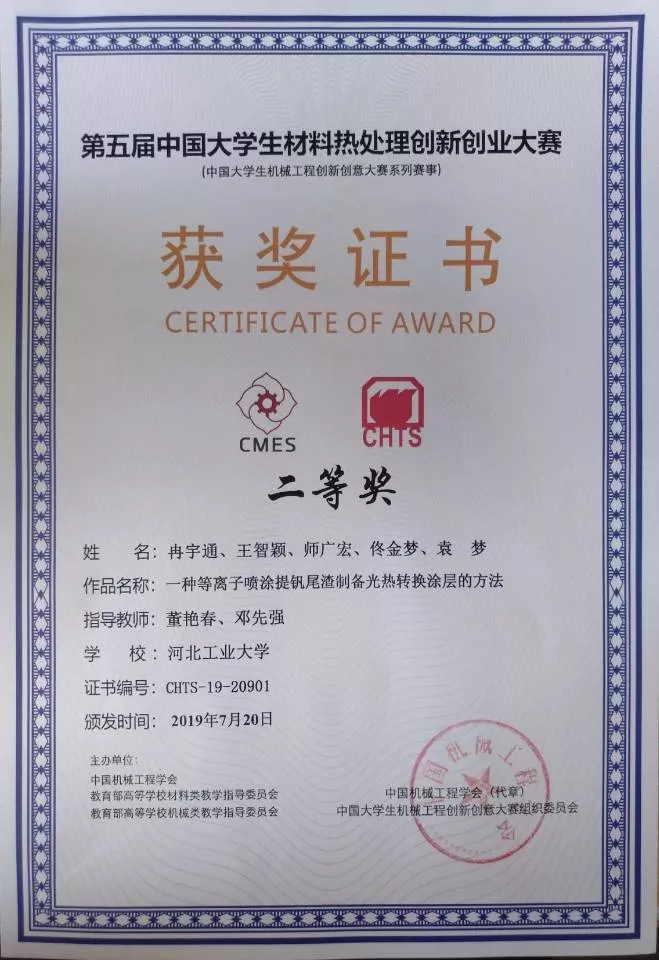 在第五届中国大学生材料热处理创新创业大赛中,我院由董艳春教授和其研究生邓先强指导,金属材料工程系16、17级学生冉宇通、王智颖、师广宏、佟金梦和袁梦五人所组成的团队代表学校进入决赛阶段的比赛,最终荣获全国二等奖,董艳春教授荣获“优秀指导教师”奖。