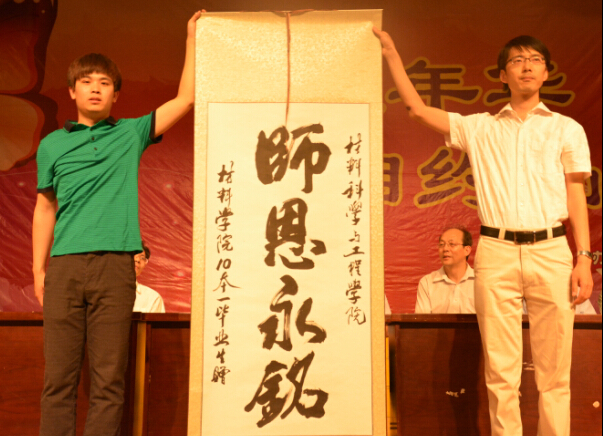 蔡斌飞同学代表2010级学生会向学院捐赠了体育用品,为学院学生活动改善了硬件条件,并以一副毕业生亲书的“师恩永铭”的题词赠送给材料学院,寄托了学生的惜别之情。