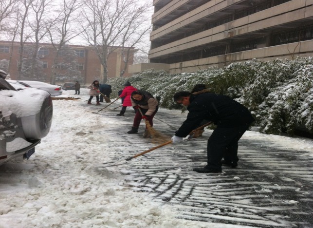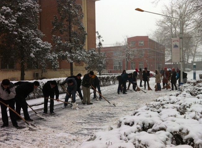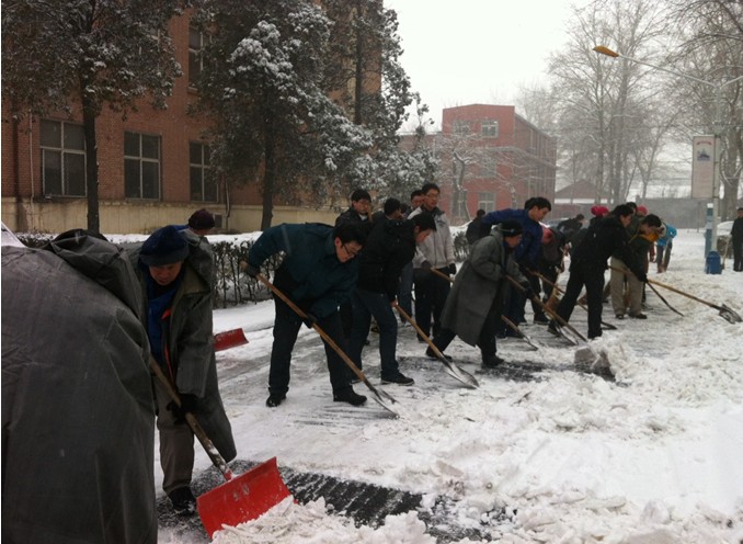在材料学院张宏标副书记的带领下,材料机关老师和辅导员们最先开始除雪。下了一夜的雪已经比较坚实了,并不好处理,但是在大家的努力下还是很快就出现了一条方便行人通行的小道。