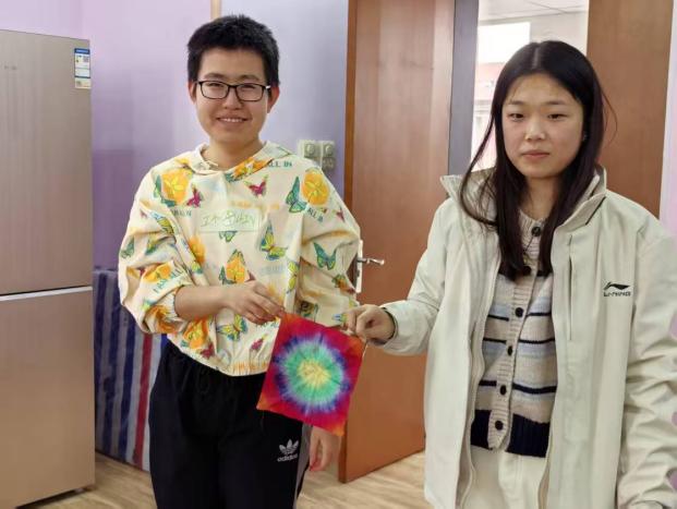 活动伊始,同学们通过生动的宣传文案了解了扎染技艺的发展脉络。在实践环节,同学们热情参与,亲手尝试了捆扎、浸染等扎染工序。从纯白方巾到独一无二的艺术品,每一件作品都承载着同学们的创意与情感。通过专注于创作,同学们暂时忘却了学业压力,在色彩与布料的交织中释放情绪,舒缓焦虑。