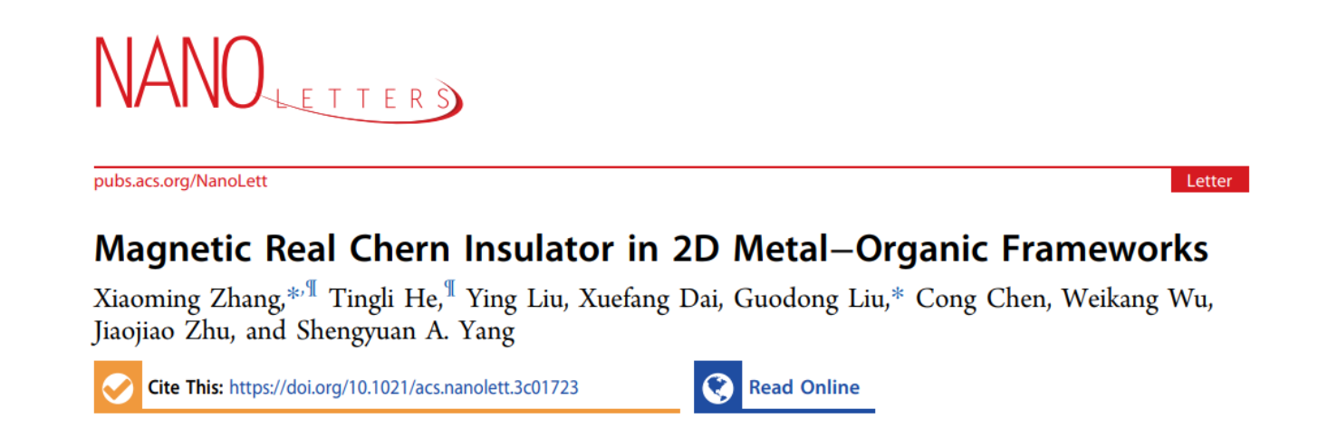 实陈数拓扑态是近年来凝聚态物理学中研究的一个焦点。它们的拓扑分类不同于传统的拓扑材料,具有独特的物理特性,如非常规的体边对应关系、非阿贝尔编织效应等。近期,实陈数绝缘体在一些碳基材料中被提出。这些材料没有磁性且自旋轨道耦合效应可以忽略不计。然而,实陈数绝缘体尚未在时间反演对称性破缺的磁性体系中获得实现。张小明教授与香港大学陈聪博士、山东大学吴维康博士、新加坡科技设计大学杨声远教授研究组展开合作,首次在一系列二维金属有机框架材料中实现磁性实陈数绝缘体。该工作于2023年8月3日,在国际期刊Nano Letters(DOI: 10.1021/acs.nanolett.3c01723.)上在线发表。张小明教授为论文第一作者兼通讯作者,我校博士研究生何婷丽为共同第一作者,我校刘国栋教授为论文通讯作者。