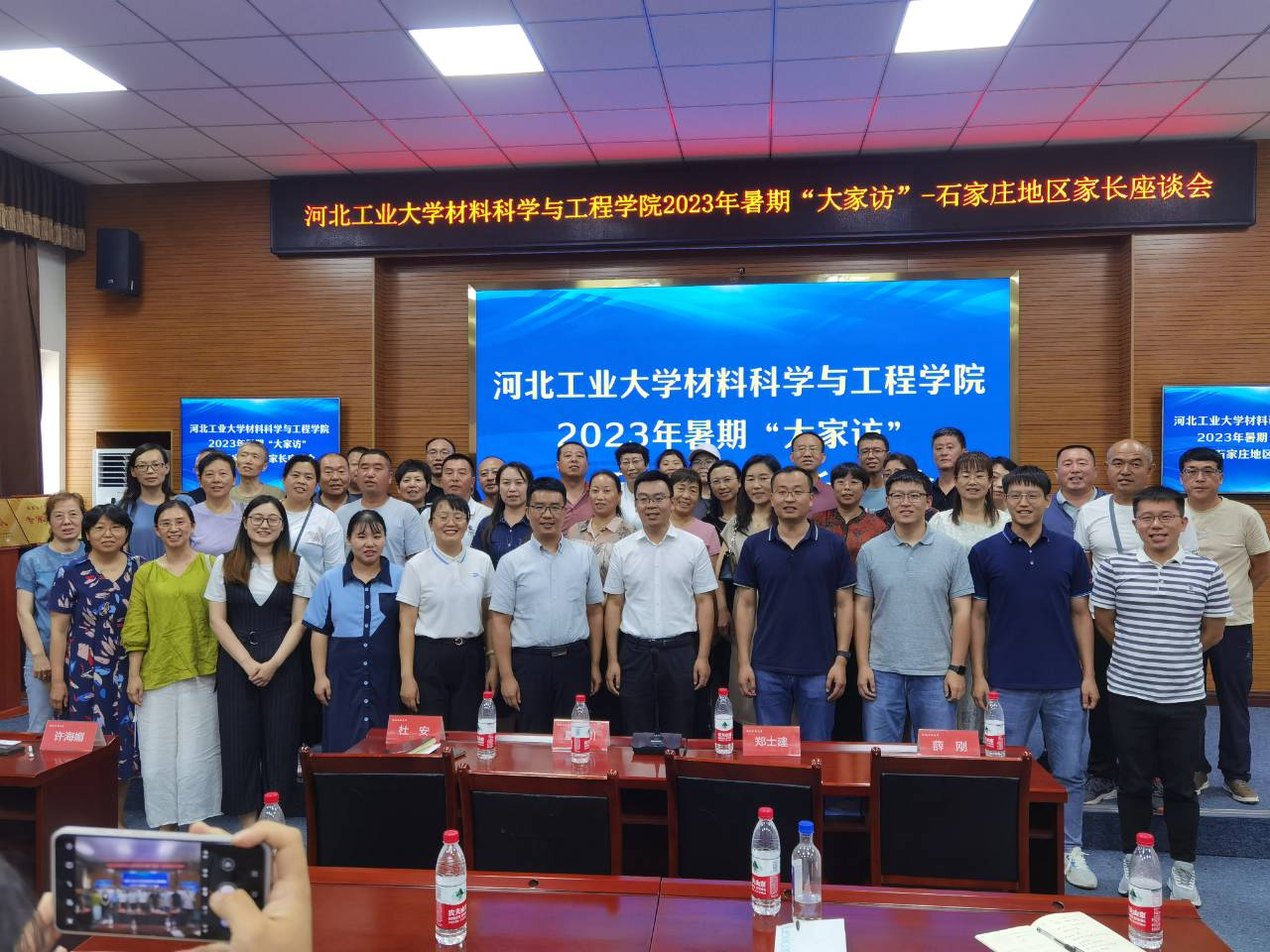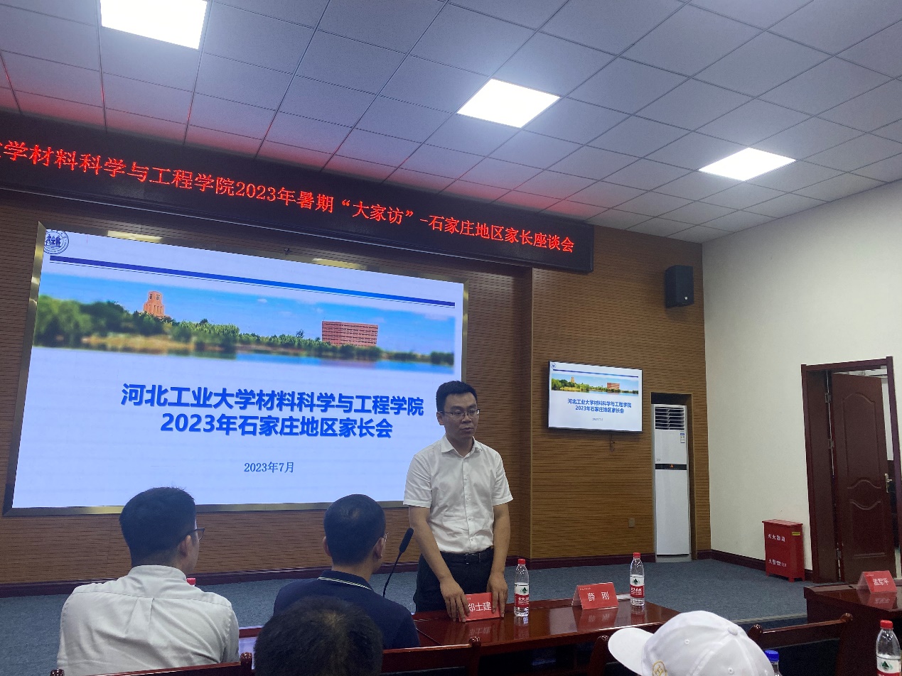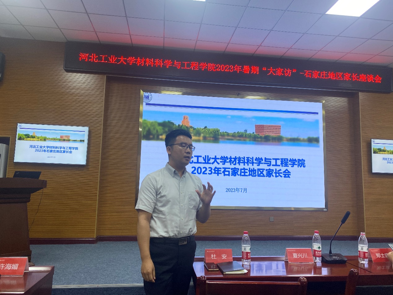 2023年7月18日河北工业大学材料科学与工程学院赴河北省石家庄市举办了石家庄市及周边地区家长见面交流会。学院院长郑士建、教学实验中心主任夏兴川、团委书记许海媚、金属材料系支部书记杜安、无机非金属材料系教授薛刚、机非金属材料系副教授孟军平、金属材料系副教授沈春光、金属材料系讲师姚凯、思想政治辅导员王珺、刘曌、李昱和40余名石家庄市及周边地区同学家长一起参加了本次会议。