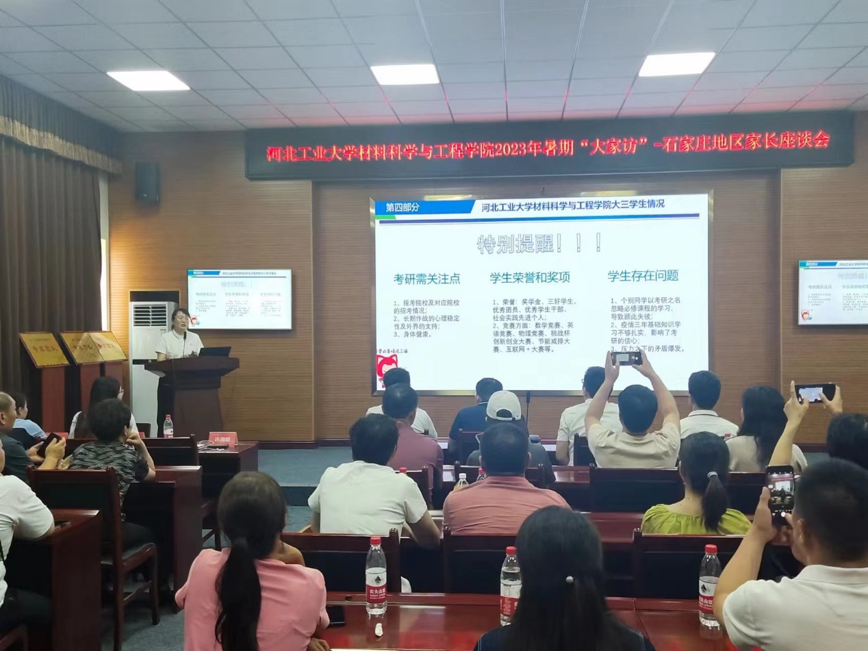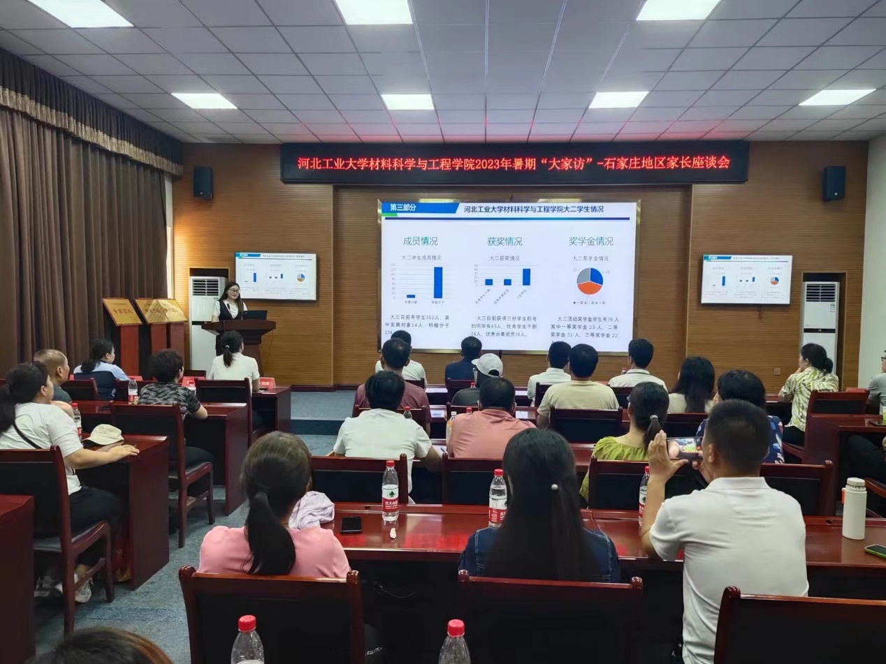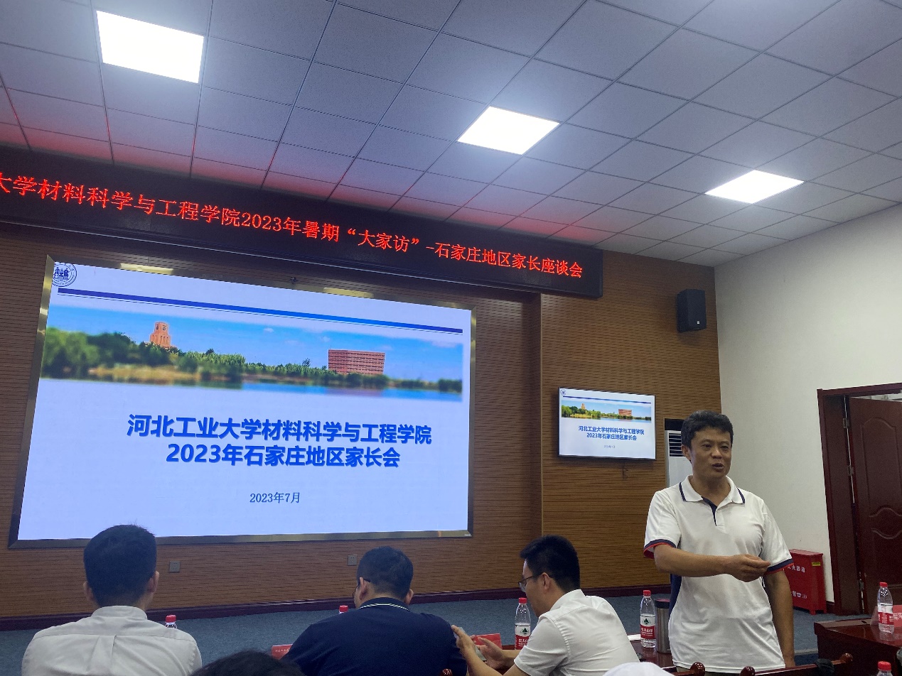 2023年7月18日河北工业大学材料科学与工程学院赴河北省石家庄市举办了石家庄市及周边地区家长见面交流会。学院院长郑士建、教学实验中心主任夏兴川、团委书记许海媚、金属材料系支部书记杜安、无机非金属材料系教授薛刚、机非金属材料系副教授孟军平、金属材料系副教授沈春光、金属材料系讲师姚凯、思想政治辅导员王珺、刘曌、李昱和40余名石家庄市及周边地区同学家长一起参加了本次会议。