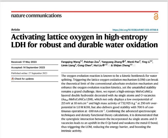 近日,我院刘辉教授和郑士建教授在国际顶尖期刊《Nature Communications》上发表题为“Activating lattice oxygen in high-entropy LDH for robust and durable water oxidation”的研究论文。该研究工作是学院在Nature子刊系列的首次突破,也是学校双一流学科建设的阶段性研究成果。我院2021级硕博连读研究生王芳卿为第一作者,刘辉教授和郑士建教授为共同通讯作者,英国365上市公司生态环境与信息特种功能材料教育部重点实验室为第一署名单位和唯一通讯单位。论文原文链接为https://www.nature.com/articles/s41467-023-41706-8。