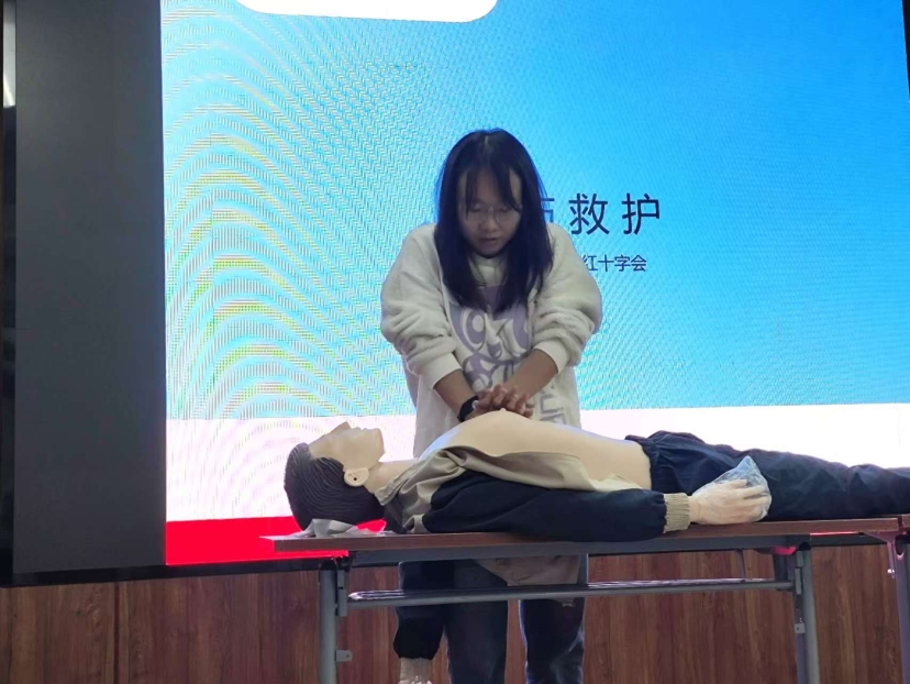 王辉向在场师生介绍了常见的紧急情况以及对应的救护方式,通过现场演示心肺复苏、创伤救护的步骤将要点和错误点逐一进行讲解。同时现场同学和老师主动上台进行实际操作,王辉对师生的操作进行指导,帮助师生进一步巩固所学理论知识,准备把握应急救护技能。