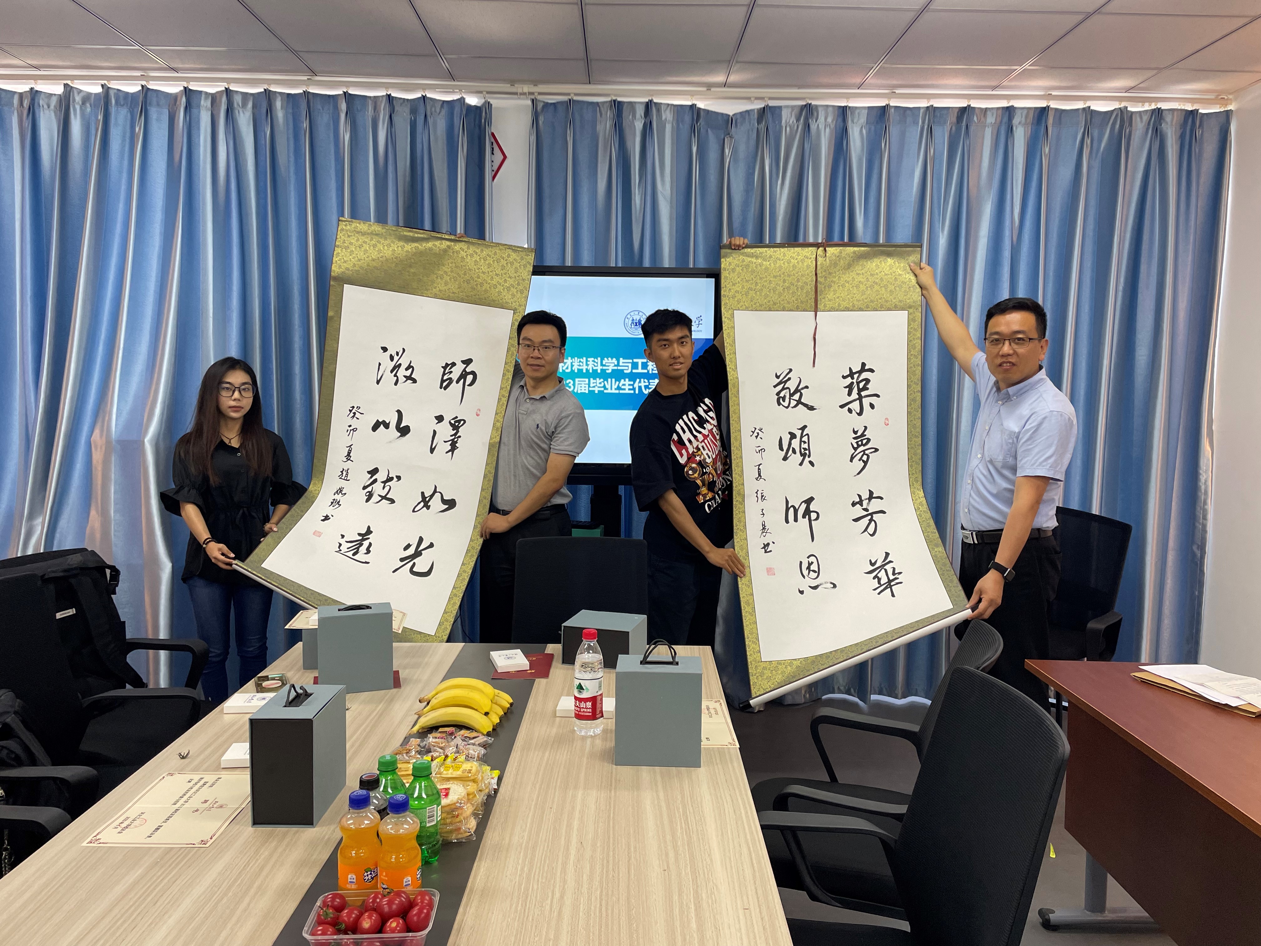 与会领导和老师为2023届校友联络员颁发了聘书和纪念品,听取了毕业生代表对于学院、学校的意见建议,对同学们的疑问做出解答。毕业生代表张子晨、赵婉璐用书法作品献上了对学院、老师的感恩和不舍。