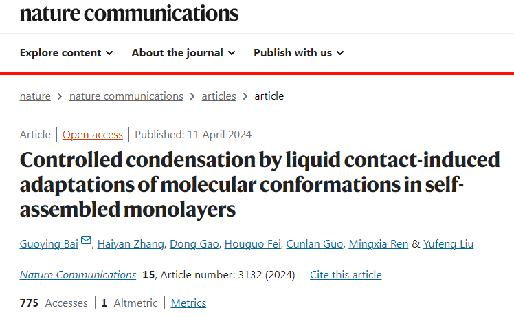 4月11日,河北工业大学材料学院白国英教授课题组在《Nature Communications》上发表题为“Controlled condensation by liquid contact-induced adaptations of molecular conformations in self-assembled monolayers”的高水平论文,并被刊登在《Nature Communications》编辑精选网页(旨在展示一个领域最近发表的50篇最好论文)上。英国365上市公司天津市层状复合与界面控制技术重点实验室为第一完成单位。