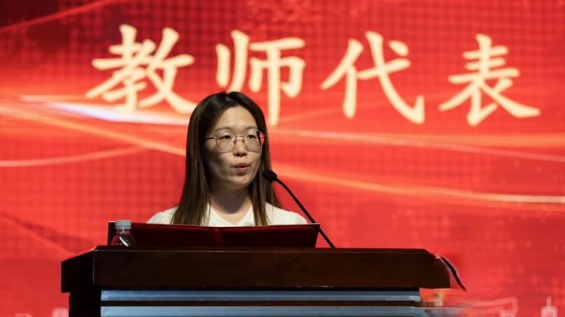成型242班班导师、研究生导学团队兼职辅导员韩露作为教师代表向新生们分享了自己作为老师的心得体会。她勉励全体新生进入大学阶段要尽快完成角色转换,确立未来目标,勤奋踏实地努力,练就健康身心以及学会面对挫折。并期望全体新生能够成为具有“家国情怀、全球视野、创新精神、实践能力”的卓越人才。