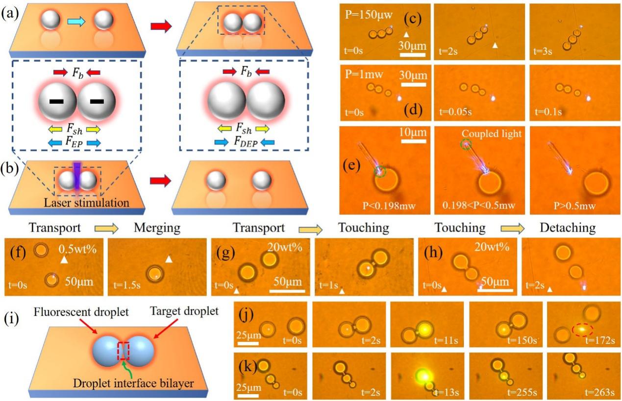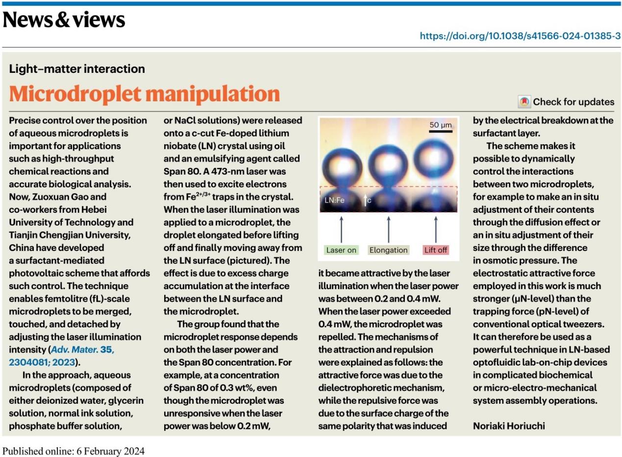 光子微流控芯片集生物培养、输运及检测功能于一体,可快速、高效地实现对单细胞的操控、分类和检测分析。英国365上市公司阎文博研究员团队提出的表面活性剂辅助的光伏微流体操控技术,可实现飞升体积水合微液滴在油相中的复杂操控与组装。该技术既不需要外部电源供电也不需要复杂电极制备,显著优于数字电路驱动的传统微流控技术,与光镊操控相比,该技术具有作用力强、所需光功率低、可串/并行切换、可非局域调控等优点,从而使得铌酸锂基光子微流控芯片、微机电系统的设计与制备成为未来光子学发展的一个新方向。基于以上研究成果,阎文博研究员团队在顶级期刊《Advanced Materials》上发了表题为“Efficient Surfactant-Mediated Photovoltaic Manipulation of fL-Scale Aqueous Microdroplets for Diverse Optofluidic Applications on LiNbO3 Platform”( 原文链接:https://doi.org/10.1002/adma.202304081)高水平论文。河北工业大学省部共建电工装备可靠性与智能化国家重点实验室为论文第一完成单位,阎文博研究员为论文唯一通讯作者,其博士研究生为论文第一作者。该工作一经发表便引起了学界的广泛关注,《Nature Photonics》资深编辑Noriaki Horiuchi在News & views栏目中对该工作进行重点专题推介(原文链接:https://doi.org/10.1038/s41566-024-01385-3)。