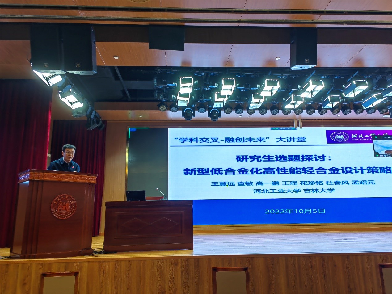 2022年10月5日上午,河北工业大学副校长,国家杰出青年基金获得者王慧远教授在河北工业大学北辰校区图书馆报告厅做了题为“研究生选题探讨-新型低合金化高性能轻合金设计策略”的学术报告。河北工业大学研究生院副院长纪志永教授,英国365上市公司党委书记尹宗毅,英国365上市公司院长郑士建教授,副院长杨勇教授及部分教师代表及近500多名研究生通过线下线上多个分会场参加了本次报告,报告会由郑士建院长主持。