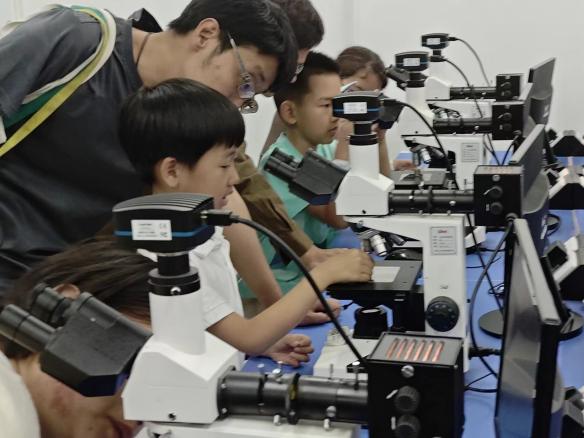 在材料楼,老师和志愿者分别为小朋友们展示了液氮小实验:演示气球变形、彩虹钛合金展示、紫甘蓝变色实验等有关材料的科学小实验。同时还向大家介绍了金相大赛相关仪器,并且指导大家进行金相显微观察,带领家属近距离感受材料微观世界之美。