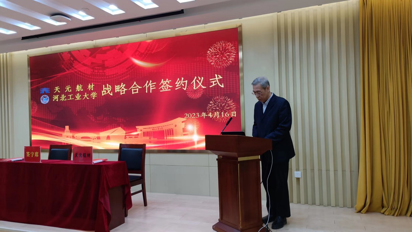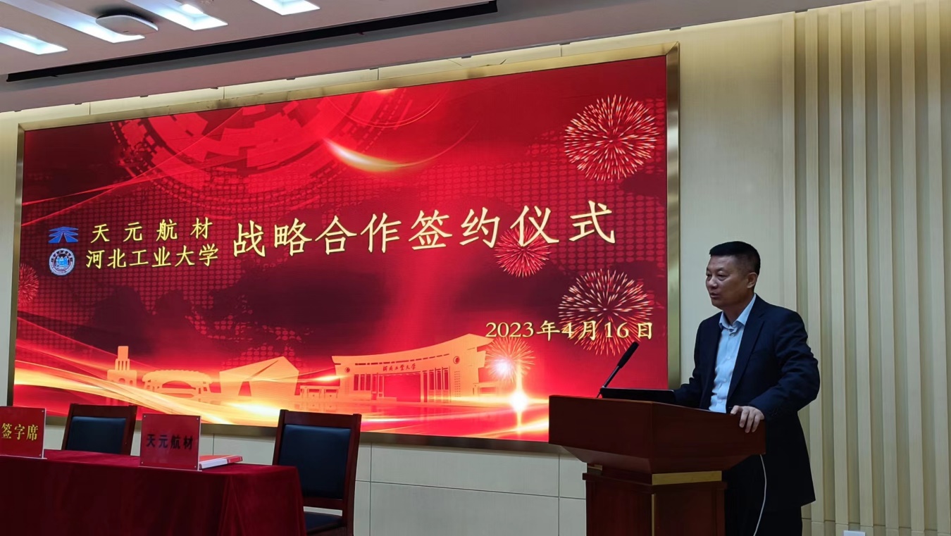 吕德斌介绍了天元航材的基本情况和科研背景,高度评价了我校在教学科研、人才培养和社会服务等方面所取得的成绩,他表示天元航材与河北工业大学的本次合作,既是双方互相信任的结果,也是增进了解、巩固深化合作关系的有力举措,更是双方面向未来、合作共赢的重要起点。希望双方坚持交流互访,不断拓展业务范围,打造校企合作典范。
