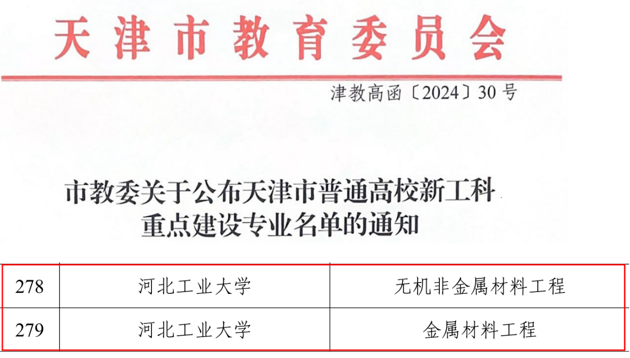 近日,天津市教育委员会印发了《市教委关于公布天津市普通高校新工科重点建设专业名单的通知》,公布天津市普通高校新工科重点建设专业名单,英国365上市公司无机非金属材料工程专业和金属材料工程专业2个现有工科专业获批天津市普通高校新工科重点建设专业。