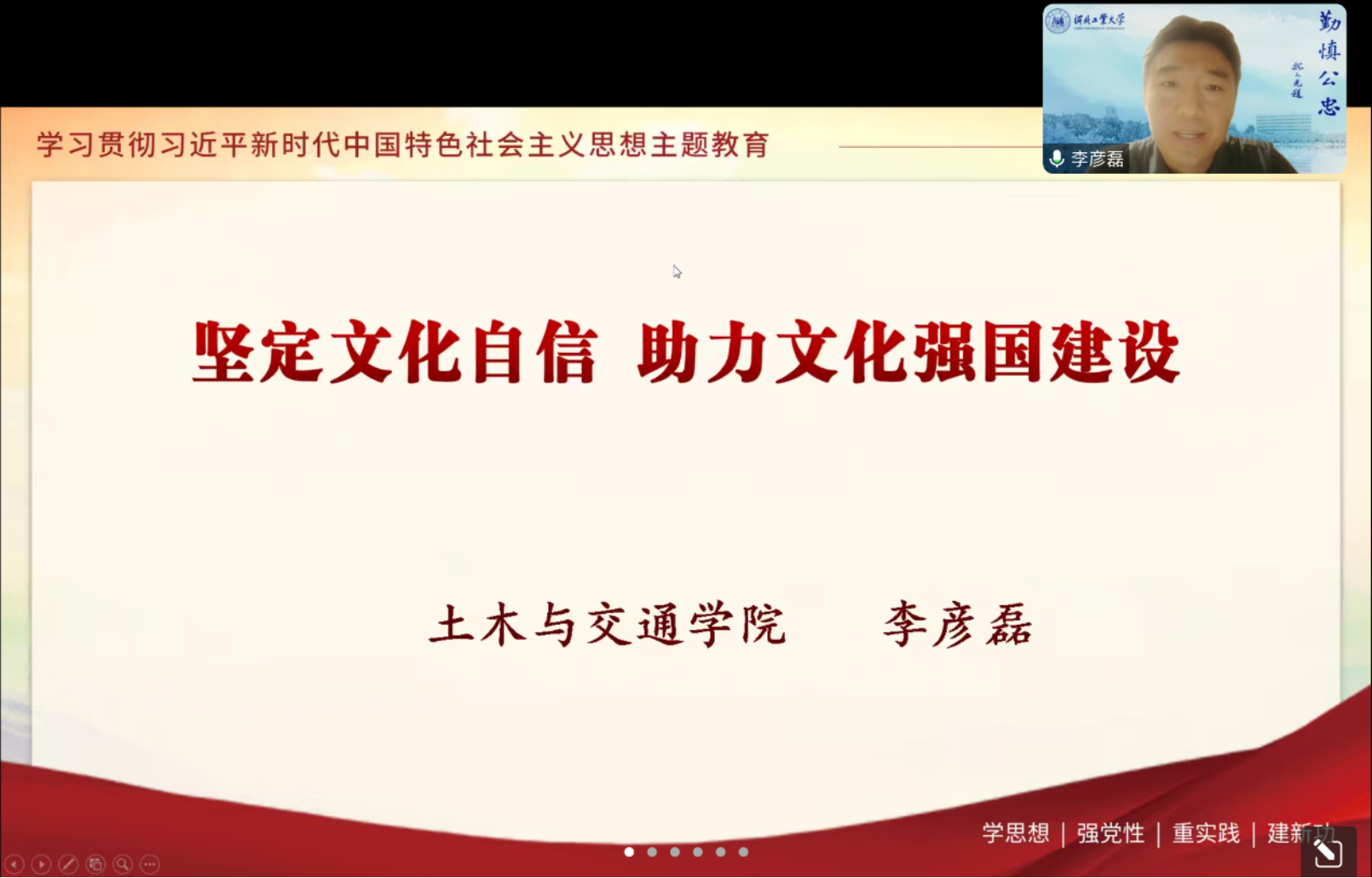 2023年5月13日晚7:00,学院邀请到我校土木与交通学院党委副书记兼副院长李彦磊以“坚定文化自信 助力文化强国建设”为主题,为我院近百名入党积极分子讲授党课,本次党课采用腾讯会议形式,旨在引导广大学生树立正确的文化观念,提高文化自信,并为实现中华民族伟大复兴贡献力量。党课由学院组织员杨璐一主持。