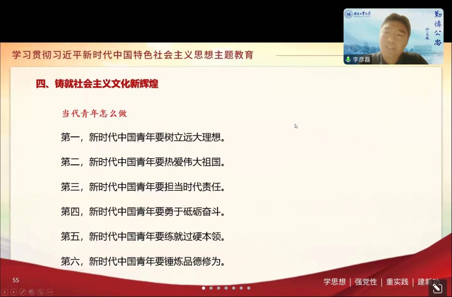 最后,李彦磊向同学们强调了要铸就社会主义文化新辉煌,最为核心的愿景就是建设社会主义文化强国,呼吁广大学生投身到社会主义文化建设之中,用实际行动铸就社会主义文化新辉煌。