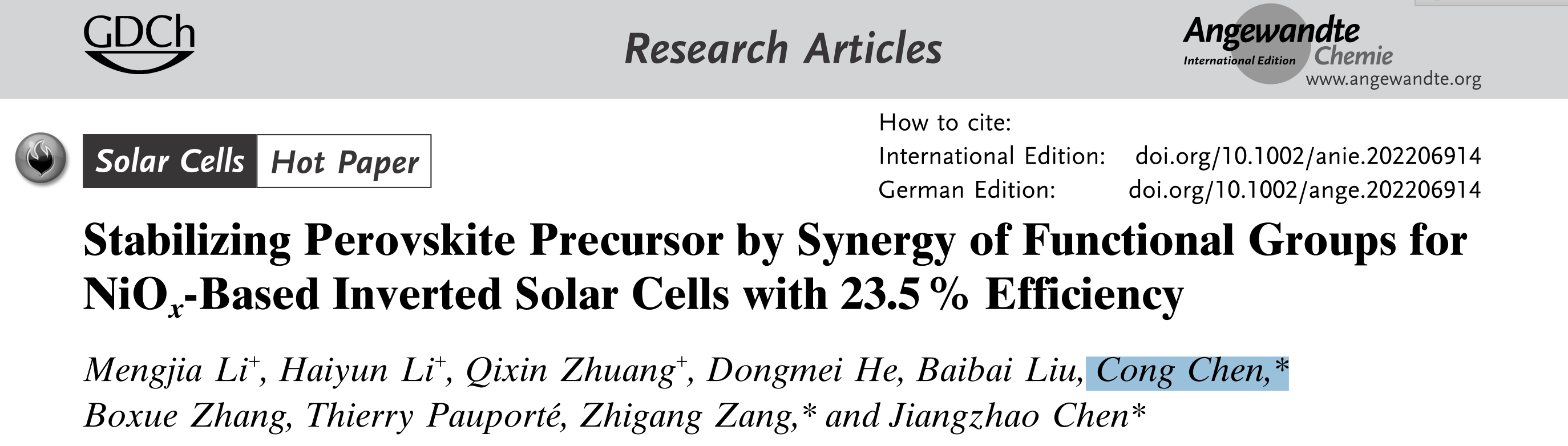 Mengjia Li1#, Haiyun Li2#, Qixin Zhuang2#, Dongmei He2, Baibai Liu2, Cong Chen1,4*, Boxue Zhang3, Thierry Pauporté3, Zhigang Zang2*, and Jiangzhao Chen2*. Stabilizing Perovskite Precursor by Synergy of Functional Groups for NiOx-Based Inverted Solar Cells with 23.5% Efficiency. Angewandte Chemie International Edition 2022,