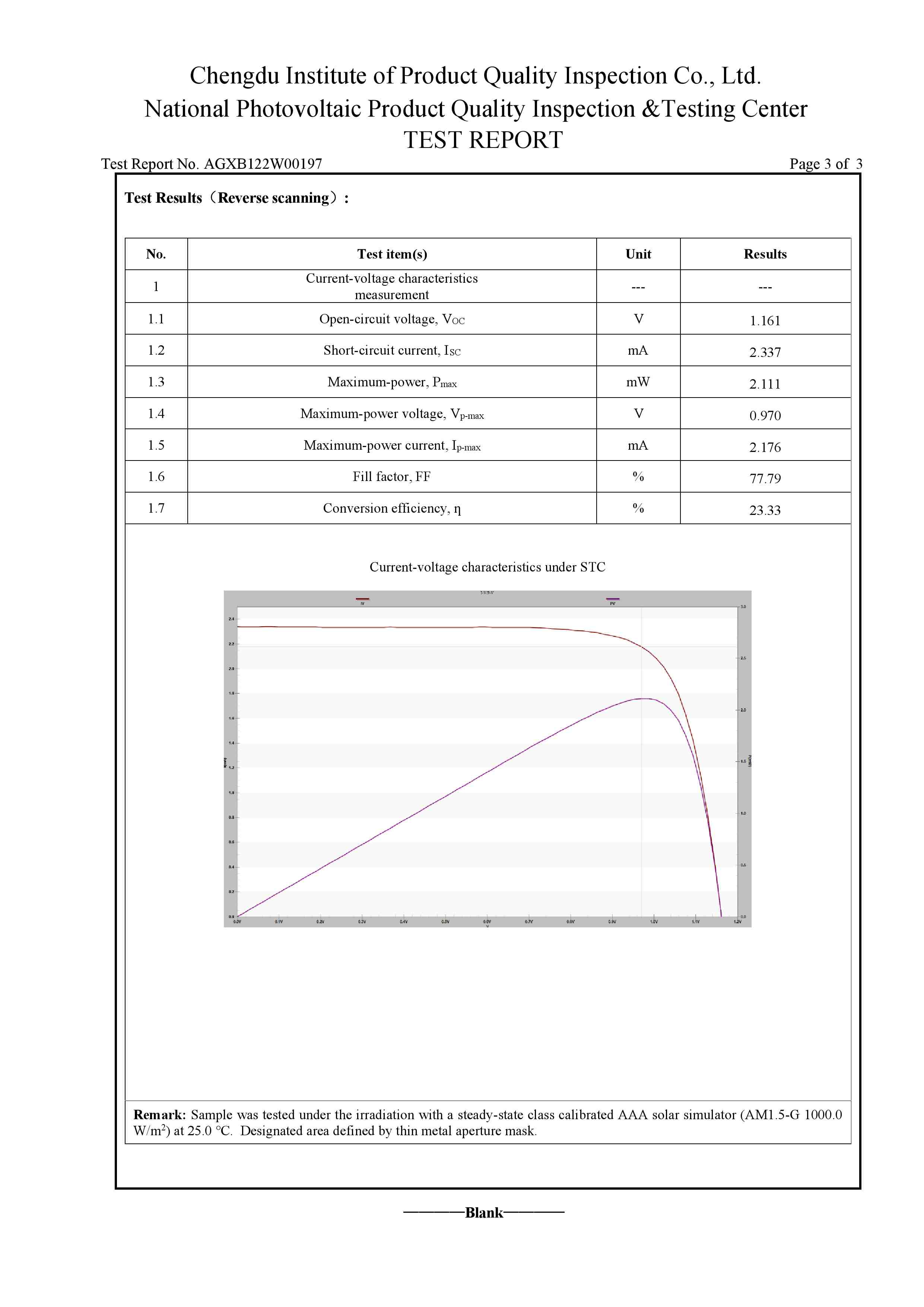 图3. 由国家光伏产品质量检验检测中心、成都光伏产品质量检验研究院有限公司出具的光电转换效率PCE为23.33%的第三方认证报告(编号AGXB122W00197)。