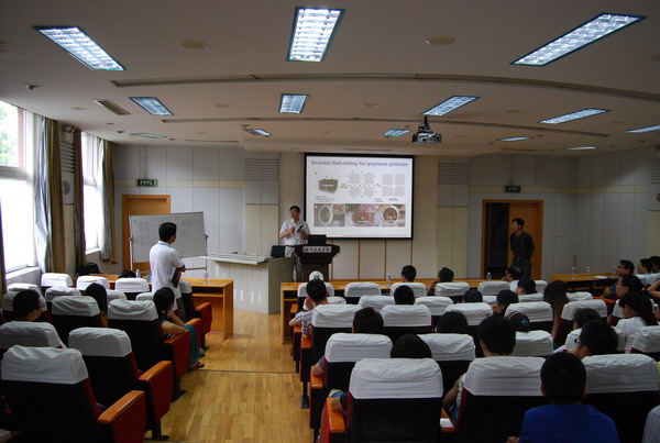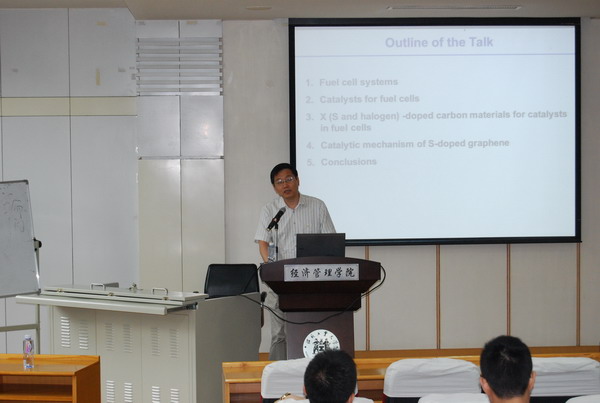 在报告中,夏振海教授介绍了其课题组的近期研究工作,目前比较清洁且可持续的电力领域是燃料电池技术。然而,燃料电池需要昂贵的金属铂作为电极材料进行催化反应。而铂有限的资源和铂催化剂成本高昂,急需努力寻找一种替代材料。在研究中,运用掺杂的碳纳米材料作为燃料电池的新型高效催化电极。结果表明,硫和卤素掺杂石墨烯纳米薄片通过球磨制成的燃料电池电极是一种优良催化剂,有望取代昂贵的铂电极。夏振海教授的精彩报告引起了在座师生的浓厚兴趣,大家积极提问,和夏教授围绕相关问题进行了热烈的讨论。