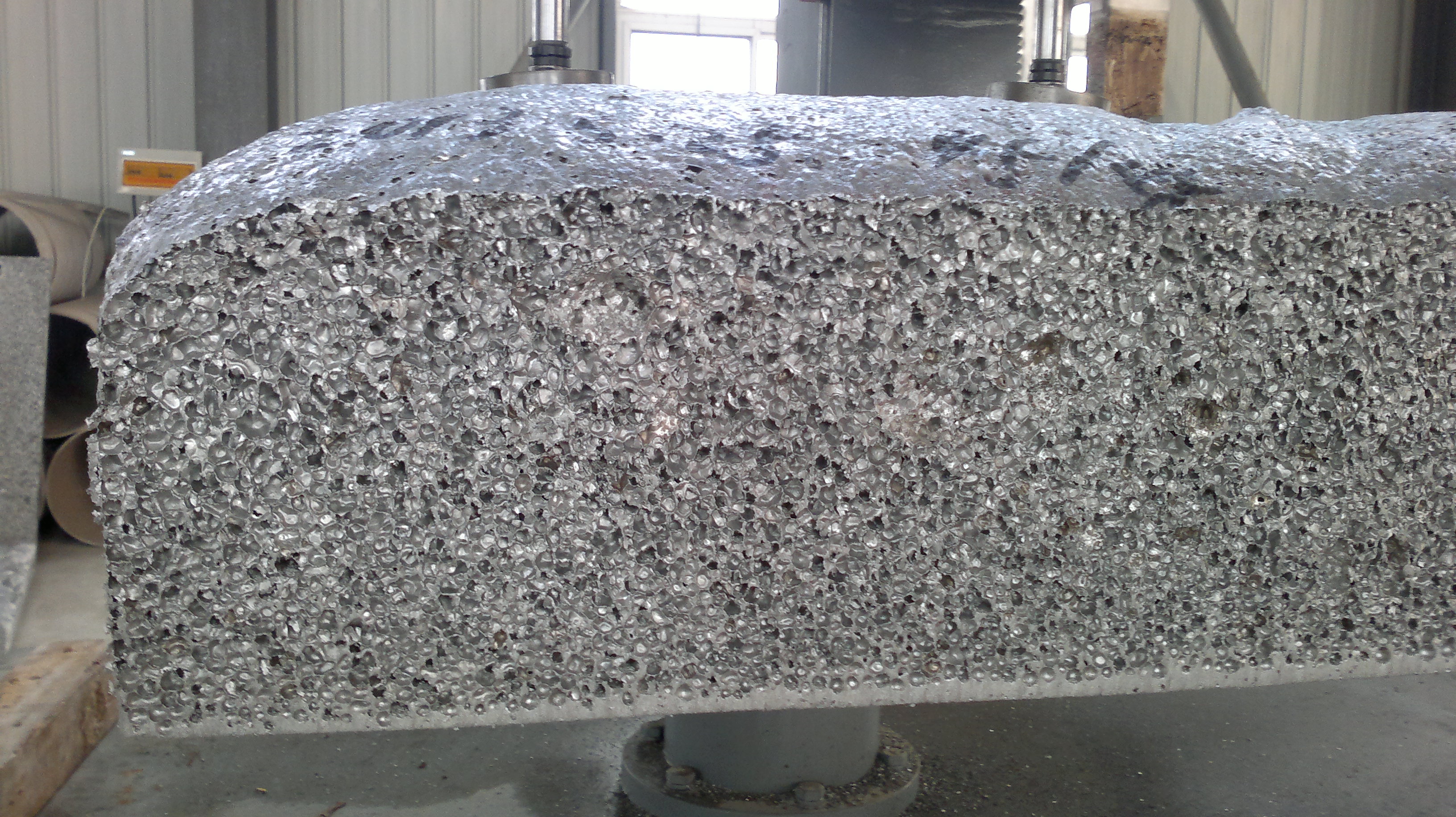 英国365上市公司赵维民教授课题组通过近 10 年对闭孔泡沫铝产业化关键技术的研究,获得完备的泡沫铝产业化参数,掌握了泡沫铝产气动力学及热力学机理。创新性地设计了具有自主知识产权的泡沫铝产业化流水线,生产线工艺参数控制精确、生产效率高、设备布局紧凑、安全性能高、自动化程度高,能够安全高效的实现泡沫铝的产业化生产,填补了国内泡沫铝产业化生产线设备的空白。河北工业大学在泡沫铝板材产业化方面 具有完全自主知识产权,产品 最大尺寸可达 1200mm ×600 mm , 是目前国内最大尺寸的一次成型泡沫铝板,产品孔结构均匀、断面美观、力学及声学性能优良。