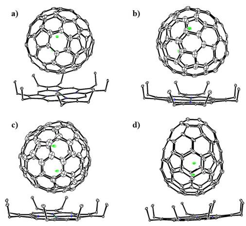 (a)Lu2@Cs(6)-C82、(b) Lu2@C3v(8)-C82、(c) Lu2@D2d(23)-C84以及(d) Lu2@C2v(9)-C86的单晶结构