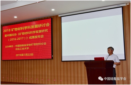 2018年7月21日至23日,由中国硅酸盐学会矿物材料分会、河北工业大学联合主办的2018全国矿物材料学科发展研讨会暨中国科协《矿物材料学科发展研究(2016-2017)》成果发布会在河北工业大学东院科技报告厅召开。来自北京大学、清华大学、中南大学、河北工业大学、中国地质大学(武汉)、中国地质大学(北京)、中国矿业大学(北京)、中国矿业大学、北京航空航天大学、北京科技大学、西南科技大学等数十所大专院校,北京有研科技集团有限公司、咸阳非金属矿研究设计院、北京矿冶科技集团有限公司、郑州矿产综合利用研究所等科研院所以及部分企业的100余位专家学者、企业家和代表出席了大会。