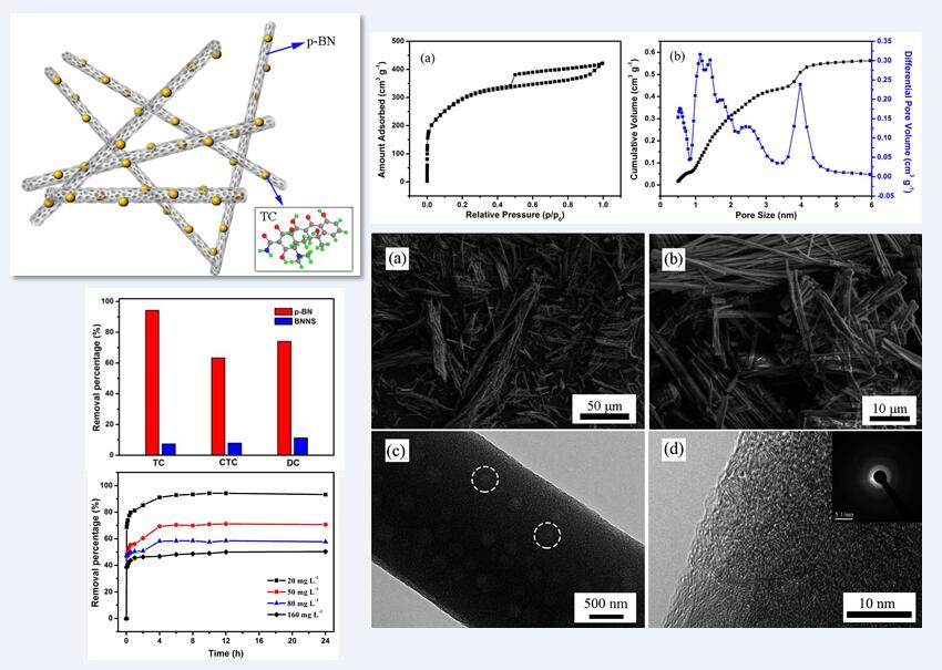 药物滥用、水产养殖废水和制药工业废水中产生的抗生素污染物对微生态和人类有着巨大的威胁。该研究制备了比表面积高达1062.88 m2 g-1且具有丰富孔结构的多孔六方氮化硼材料(p-BN),证明了p-BN对四环素类污染物优异的吸附性能并开展了系统的理论研究。结果表明,它在高浓度下对四环素具有快速的吸附速率和有效的去除率(94.25%)。在160 mg L-1的浓度下,最大吸附容量可以达到322.16 mg g-1。准二级动力学模型和粒子间扩散模型说明TC在p-BN微孔中的分子扩散是限速步骤。由热力学计算可得,吸附过程是自发和放热的,较低的温度有利于吸附。盐析效应使得吸附容量随着添加的Na+离子增加而上升。吸附等温线更符合Freundlich和Tempkin模型,吸附机理主要是π-π相互作用和静电力。该成果为新材料的制备及水环境治理提供了技术和理论支持,具有重要的研究意义和实际应用价值。