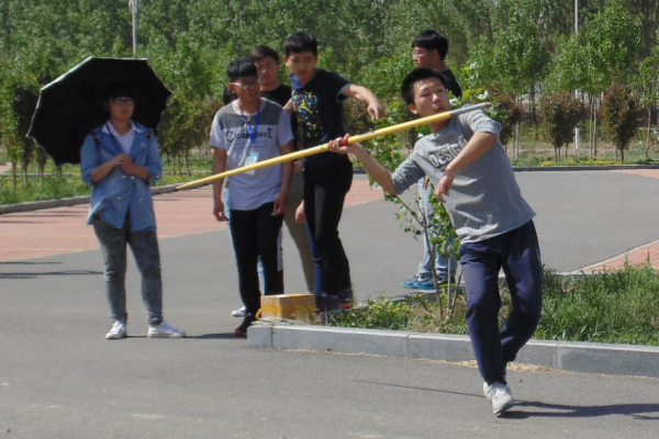 径赛赛场上运动员们奋发拼搏,参加田赛的运动员们也不甘寂寞。跳远运动员们在空中滑越出一道道优美的曲线,沙坑里渐远的脚印,展现着青春的拼搏和激情;参加标枪等投掷类项目的运动健儿们更是将满腔的热血注于双手,用尽全身力气,投掷出属于自己的一片天地。