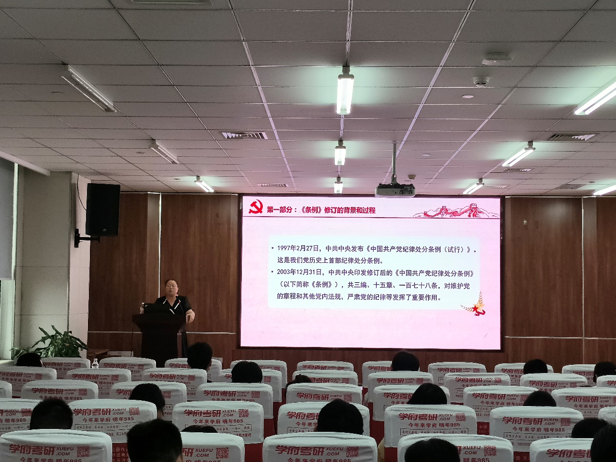 2024年6月21日下午14:00,英国365上市公司2023-2024年春季学期党课培训第九讲在机材楼514开展。本次党课以“全面加强党的纪律建设——《学习解读中国共产党纪律处分条例》”为主题,由学院正处级辅导员张雪莹担任主讲人,学院积极分子百余人参会。