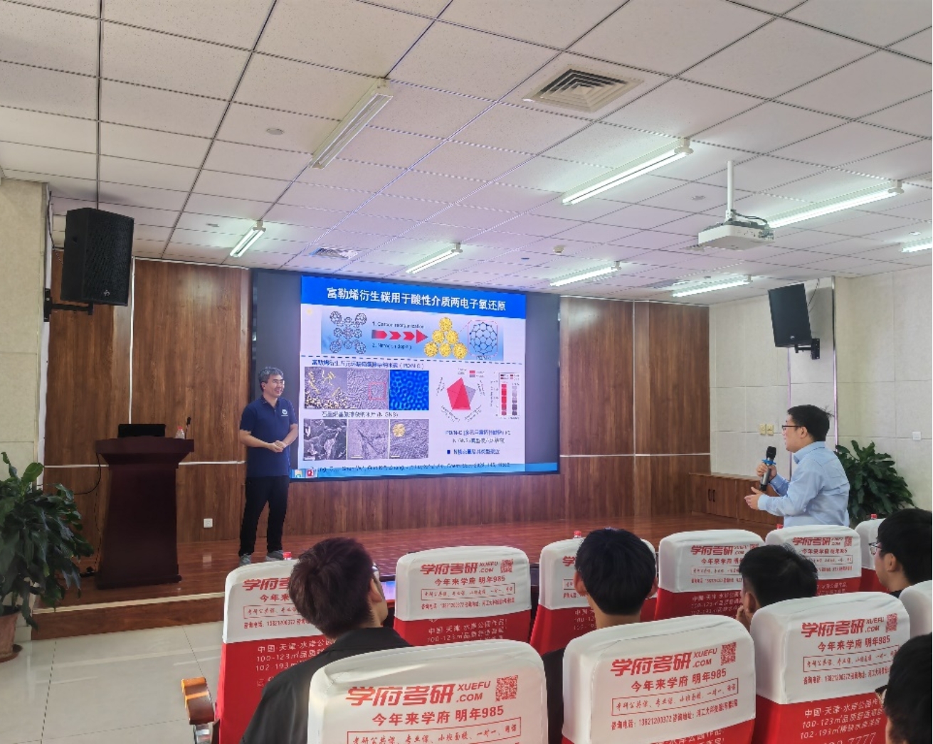 卢兴教授就富勒烯相关材料的制备与应用进行了细致阐述,介绍了金属富勒烯的种类及制备过程,讲述了富勒烯与碳纳米管以及石墨烯的关联,简单介绍了富勒烯笼的限域效应对稀土离子化学成键的重要影响,展示了未来富勒烯及其衍生物在电池、催化以及光学器件等诸多领域的巨大应用前景。卢教授的精彩讲解使我们对富勒烯微纳材料有了新的认识和理解。此外,卢教授还分享了两种科技创新的范式:目标导向和兴趣驱动。前者目的性强,效率高,成果显著;后者目标广泛,形式多样,不可预期。两种方式各有特点,值得思考和借鉴。报告结束后,卢教授与在场师生进行了积极互动,就富勒烯的制备与应用等细节问题做了进一步的交流和讨论。