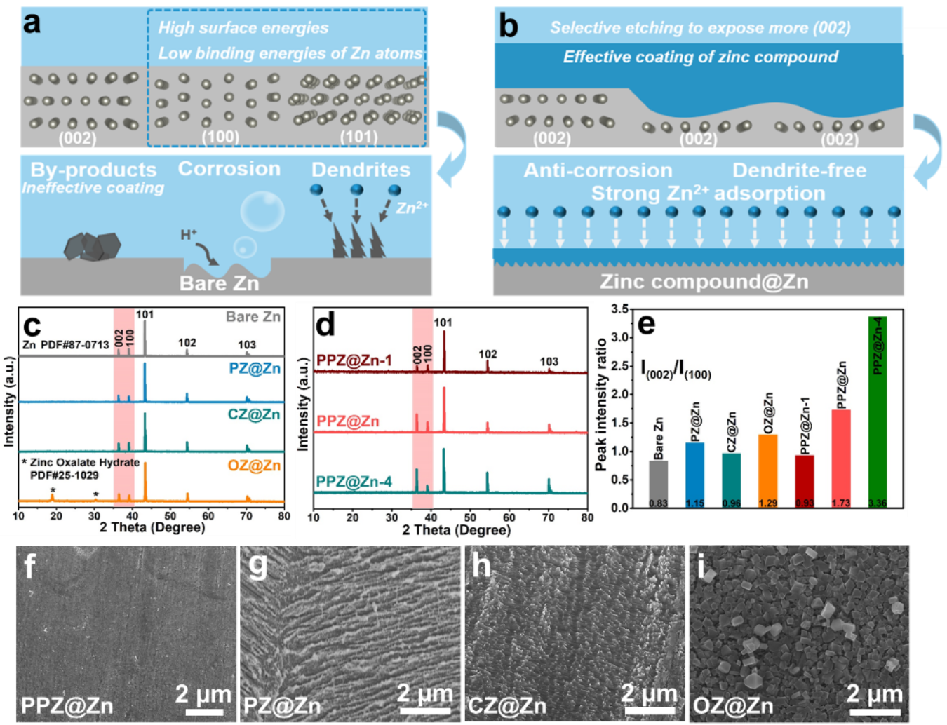 针对水系锌离子电池中锌金属负极存在的问题,我院生态环境功能材料研究团队的青年教师王亚平博士提出一种表面/界面改性锌金属负极的新方法,即采用酸腐蚀的方法选择性暴露(002)Zn晶面并在电极表面原位生成锌化合物层,实现在对称电池中超长的锌沉积/剥离循环时间(3000 h)及在全电池中较长的大电流循环寿命(1250圈)。