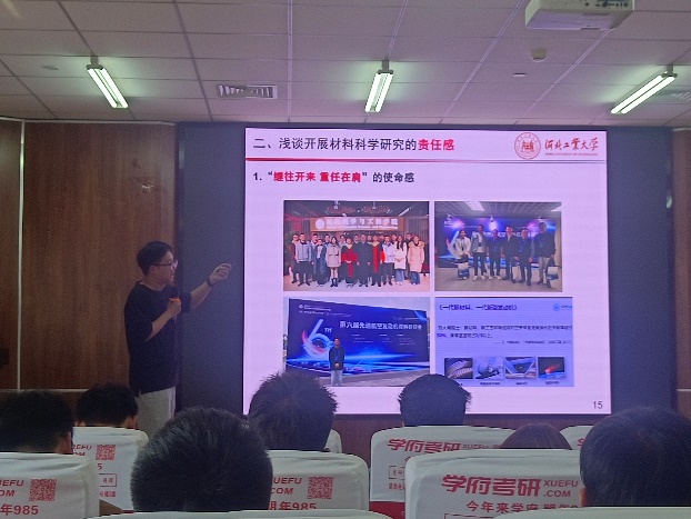 第一,他与同学们探讨了作为一名材料学子在开展材料科学研究方面应有的责任感。他以“一代材料,一代装备”为启发,介绍了自己在研究生期间所做的科研实践与工作及自己在其中获得的成长。他强调,我们应该培养“继往开来,重任在肩”的使命感,及“时不我待,冲锋在前”的紧迫感。