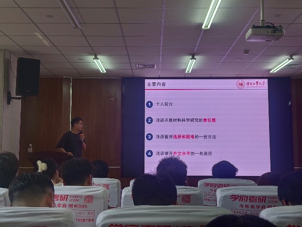 邵宇轩主要从“浅谈开展材料科学研究的责任感”、“浅谈面对选择和困难的一些方法”、“浅谈提升外文水平的一些途径”三个方面为同学们展开讲解。