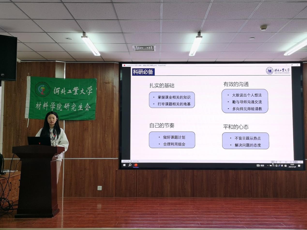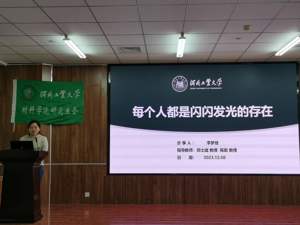 李梦佳,2023年研究生国家奖学金获得者,以第一作者发表SCI论文5篇,第二作者SCI论文3篇。曾获得河北省研究生创新资助项目1项、第八届 “互联网+”大学生创新创业大赛国赛铜奖、2023年河北工业大学三好学生、2022 年研究生一等学业奖学金、励志奖学金、2020、2021年研究生一等学业奖学金、2021年河北工业大学优秀学生干部、河北工业大学第三届学术演讲比赛一等奖、承担国家重点级大创项目、优秀学生干部、优秀共青团员等。李梦佳在交流会中分享了自己是如何从科研小白入门、科研人如何搞好科研、科研人如何写好自己的第一篇文章、科研人如何平衡好活动与科研、科研人如何面对焦虑以及读研的意义这六个方面,讲述了自己科研中的见闻。最后鼓励学弟学妹们要保持好心态,快乐充实地投入每一天的学习中。