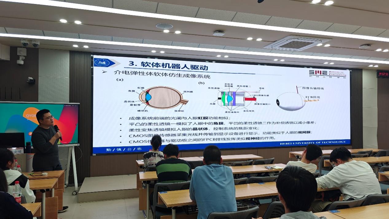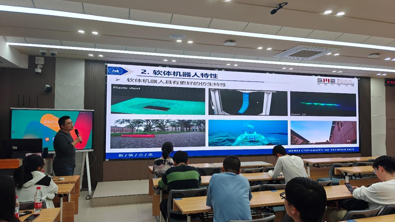 李金嵘老师,工学博士,河北工业大学机械电子工程学科的优秀讲师与硕导。他在软体机器人、柔性传感与驱动、智能材料与结构等前沿领域深入探索,在Advanced Functional Materials 、Soft Robotics等国际知名期刊发表学术论文10余篇,还拥有2项授权国家发明专利 ,在学术和科研上成果丰硕。李老师凭借着深厚的学术素养,为同学们展现了软体仿生机器人的无限魅力。他提到,软体仿生机器人与传统机器人相比,有着更好的柔韧性和环境适应性,拥有着无比广泛的应用市场,它是当今世界科学研究的前沿领域,认识和学习该仿生机器人对同学们有着很大的帮助。
