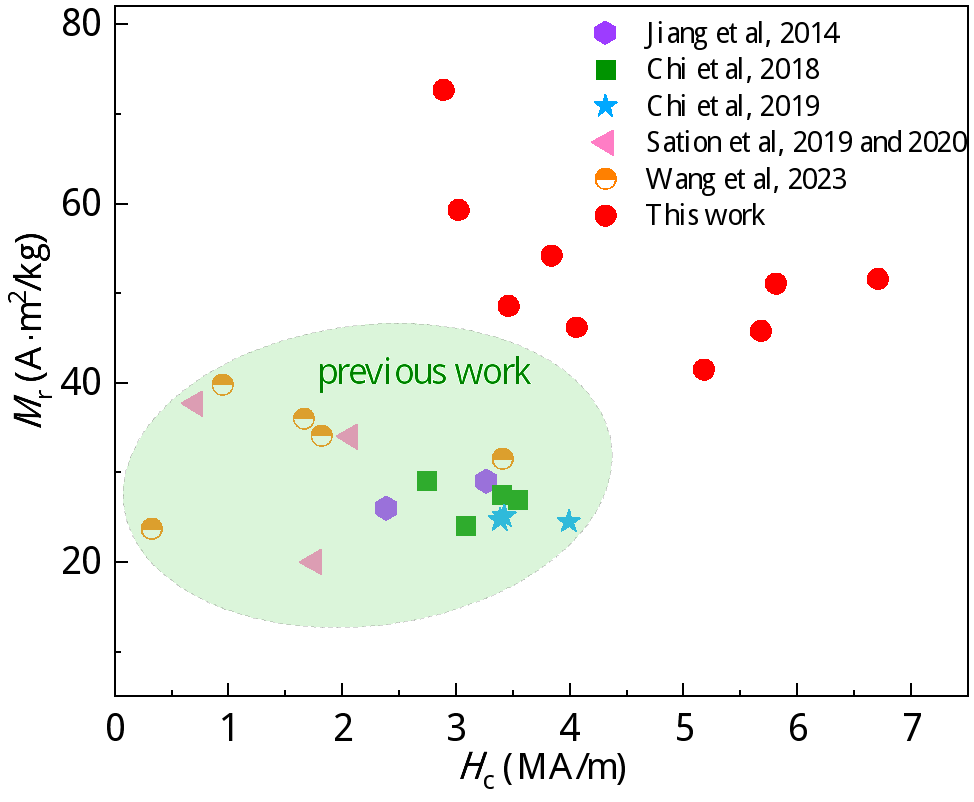 众所周知,Nd-Fe-B和Sm-Co基合金是最广泛应用的稀土永磁材料。高的室温矫顽力被认为是具有优异高温永磁性能的必要条件。在4.2 K下六方晶系SmCo4B相的各向异性场95.49 MA·m−1远大于SmCo5相的56.50 MA·m−1,是目前已知的最硬的硬磁性相。然而,其低饱和磁化强度和实际矫顽力严重限制了其可能的应用。在许多磁性同行的基础上,孙继兵教授团队经长时间地探索(10.1016/j.matlet.2024.136124;10.1016/j.jallcom.2023.170266;10.1016/j.jallcom.2023.169107;10.1016/j.jallcom.2022.163687;10.1016/j.jnoncrysol.2021.120751;10.1063/1.5099331;10.1016/j.jmmm.2018.06.049),发现添加Pr、Fe可以提高SmCo4B合金的磁化强度到34.8 A⸱m2⸱kg−1,添加Cu可以提高合金的室温矫顽力到最高3.99 MA·m−1,但磁化强度与矫顽力总是倒置的变化关系;而且添加Fe导致SmCo4B合金表现为多相的复杂微结构。而本文为充分利用这种多相的微结构同时提高Sm-Co-B合金的室温矫顽力与磁化强度提供了一种新的思路。